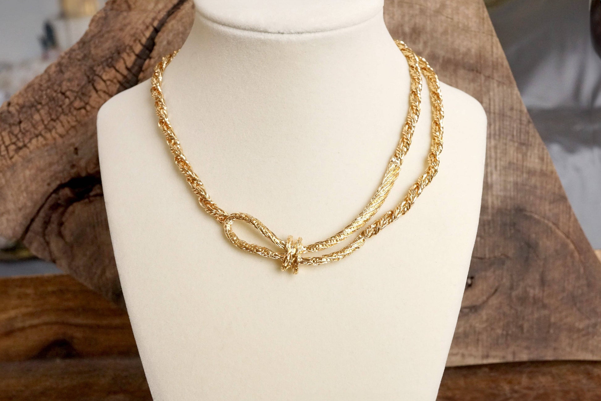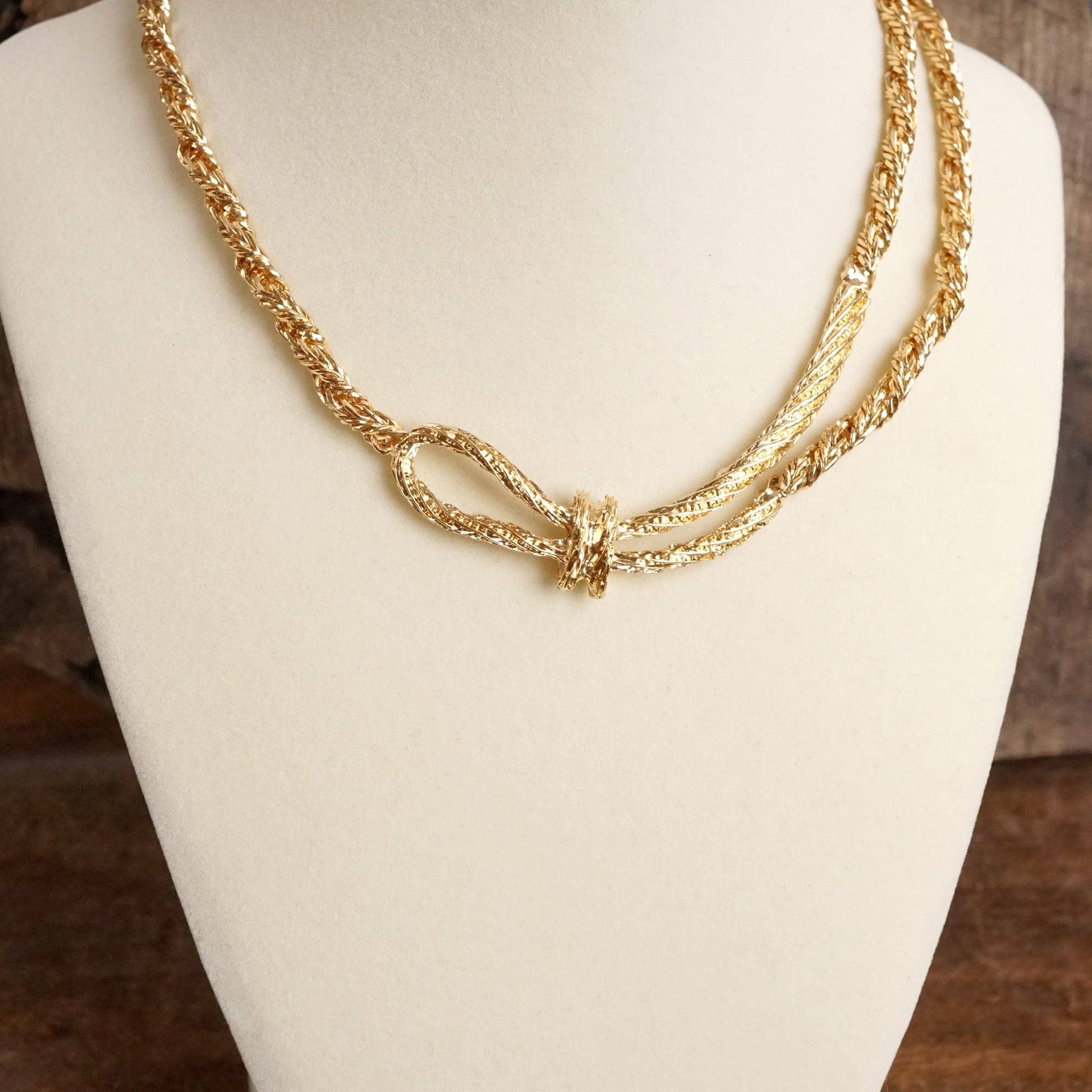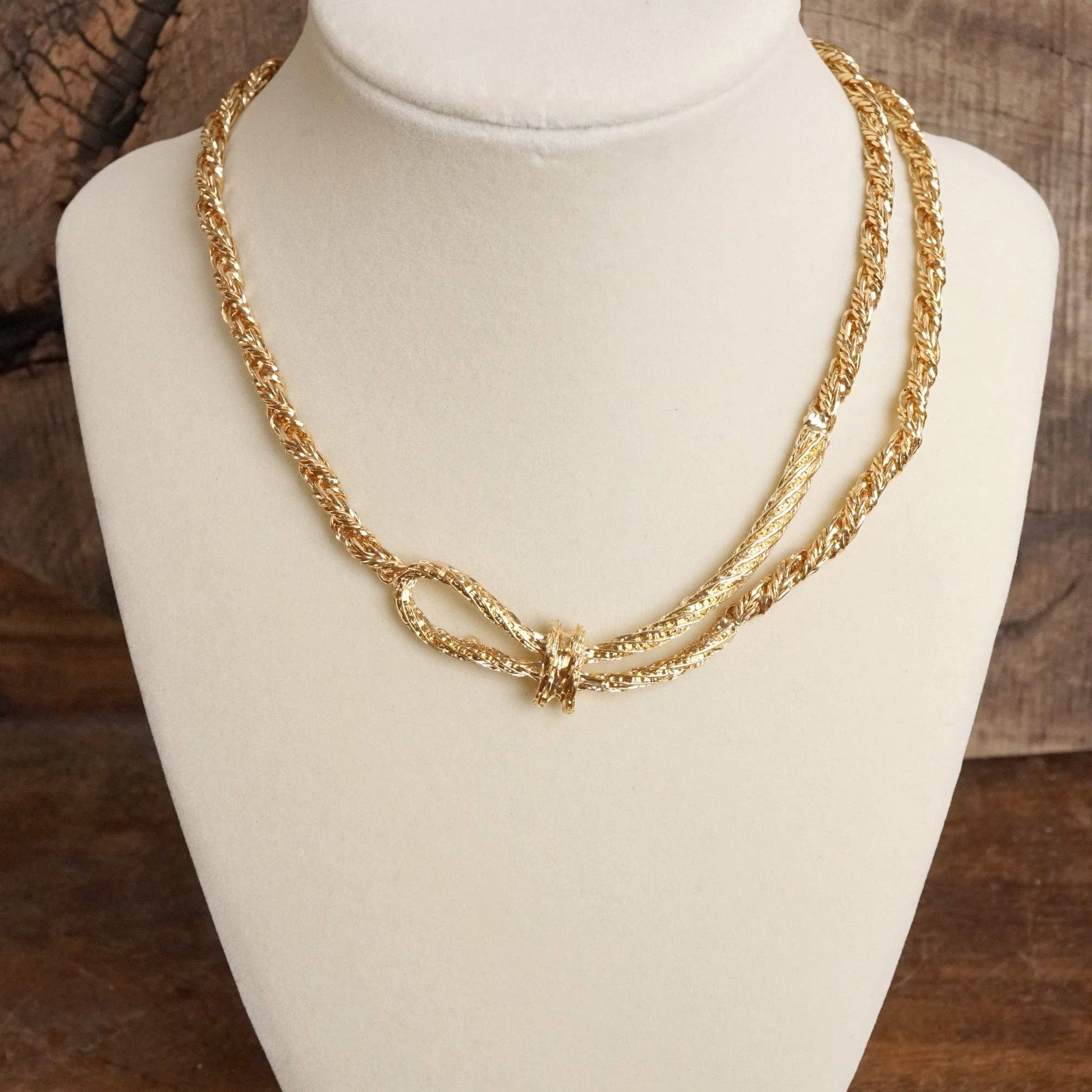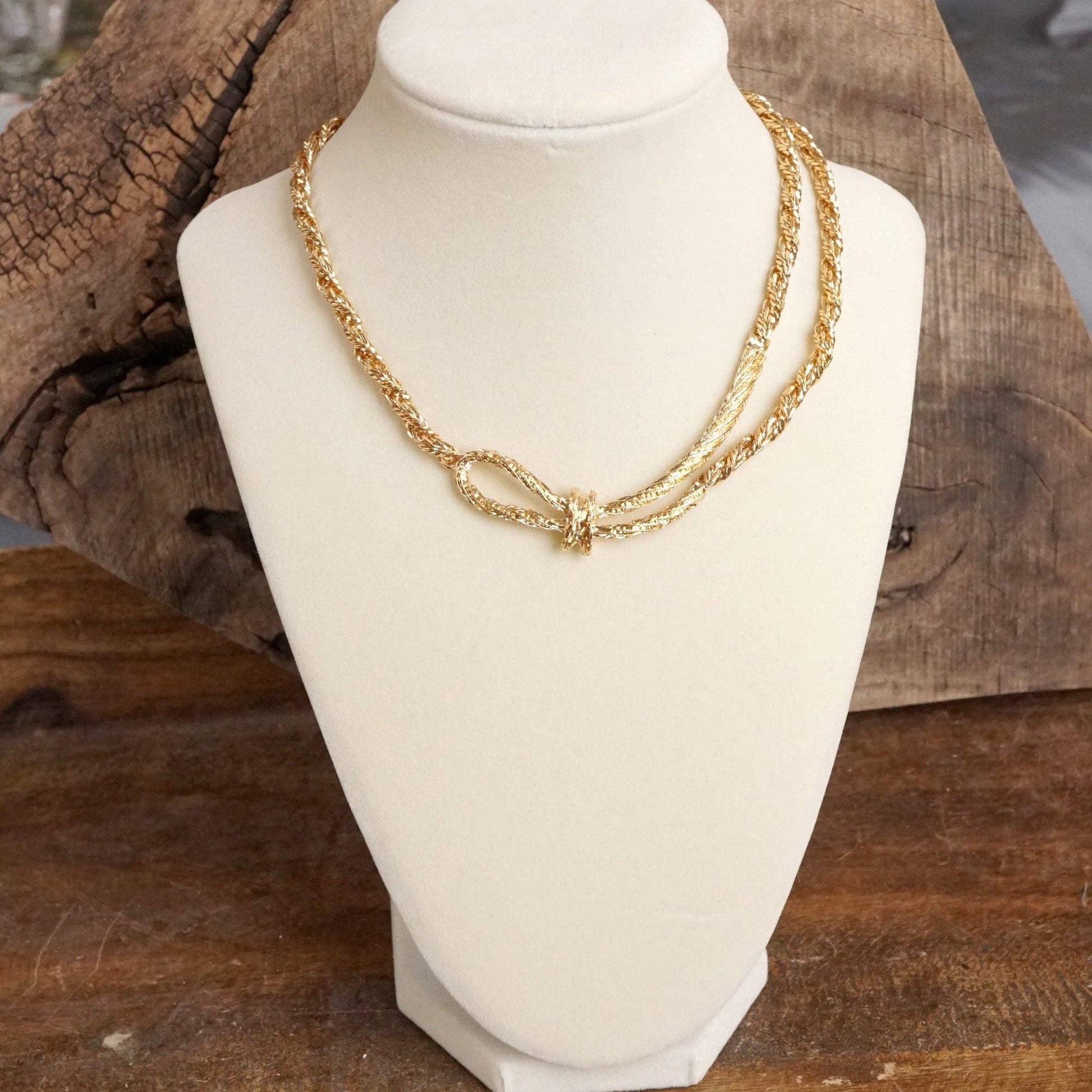A bold fusion of texture and movement, this asymmetrical necklace pairs a knotted rope-inspired centerpiece with a sleek wheat chain for an effortlessly boho-chic statement. Its classic gold-tone finish makes it perfect for layering or wearing solo.