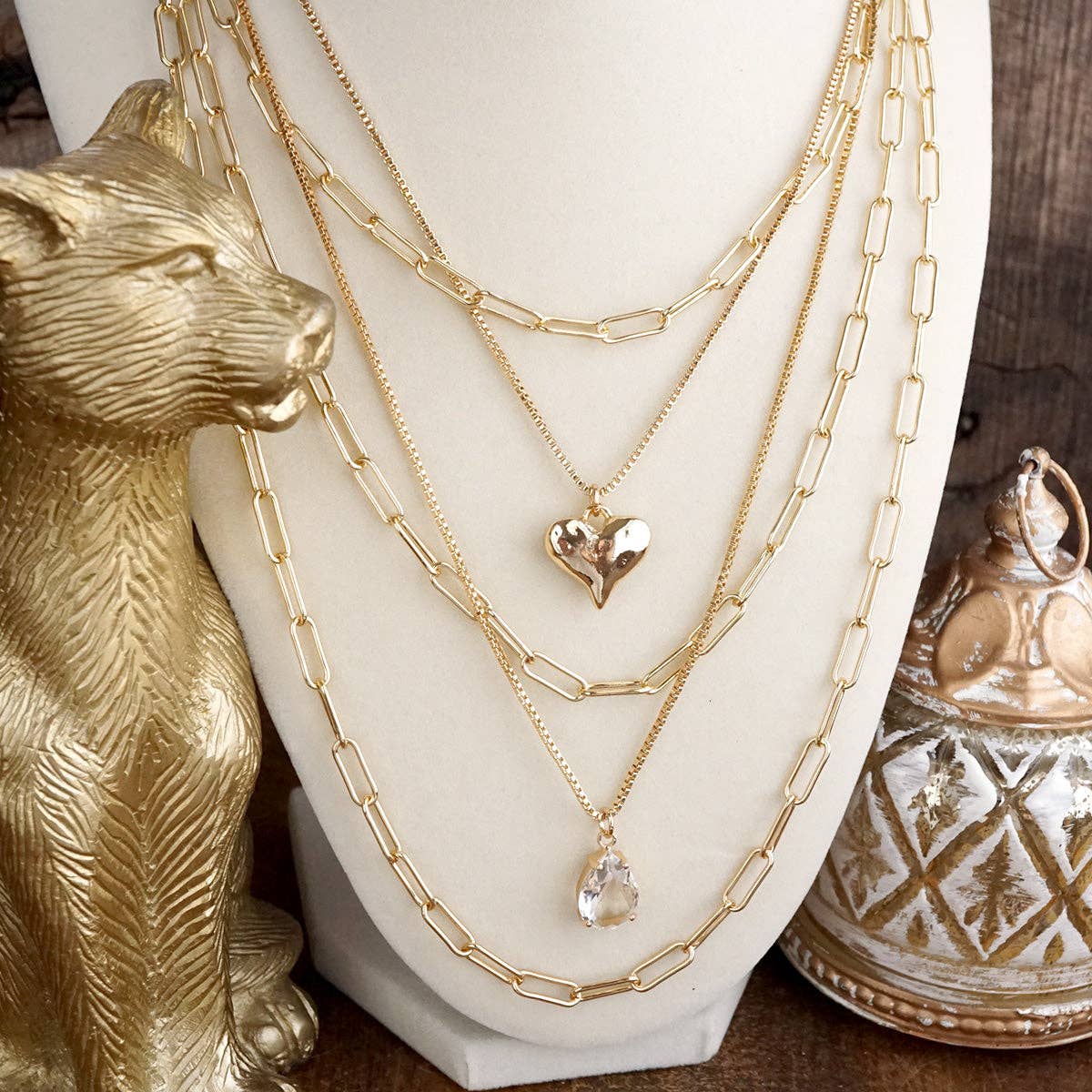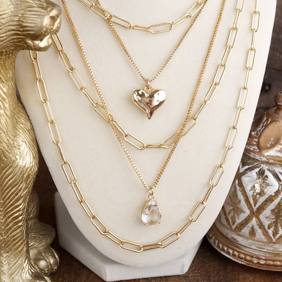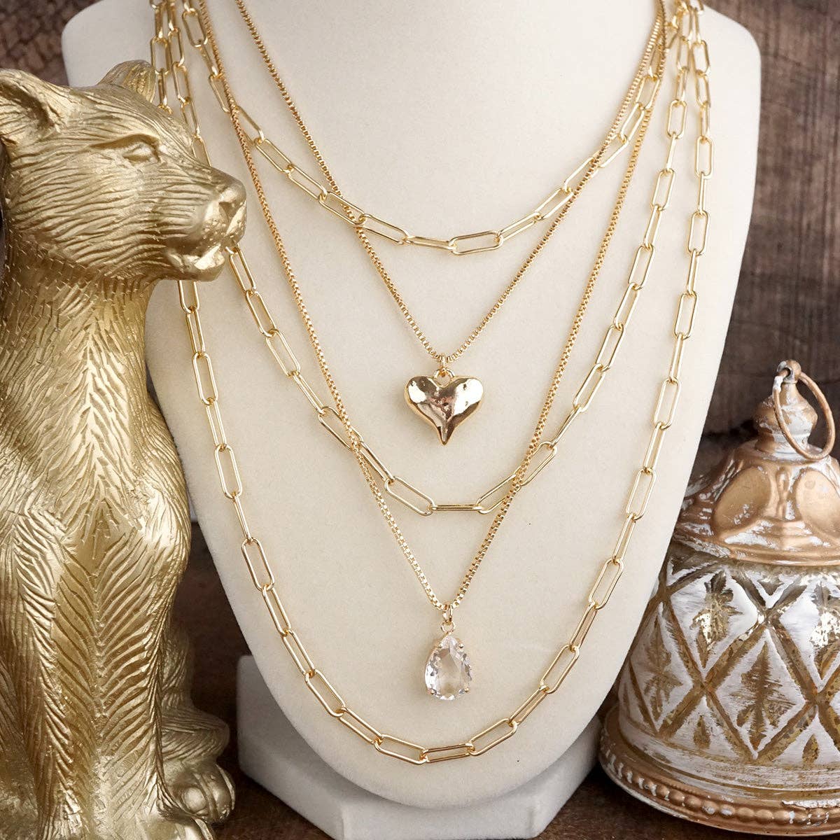 A ready-made stack for everyday romance. Five gleaming chains—two box, three paperclip—drift together in perfect harmony, anchored by a puffy hammered heart and a faceted teardrop crystal set in a sweet golden basket. A layered look, done for you.